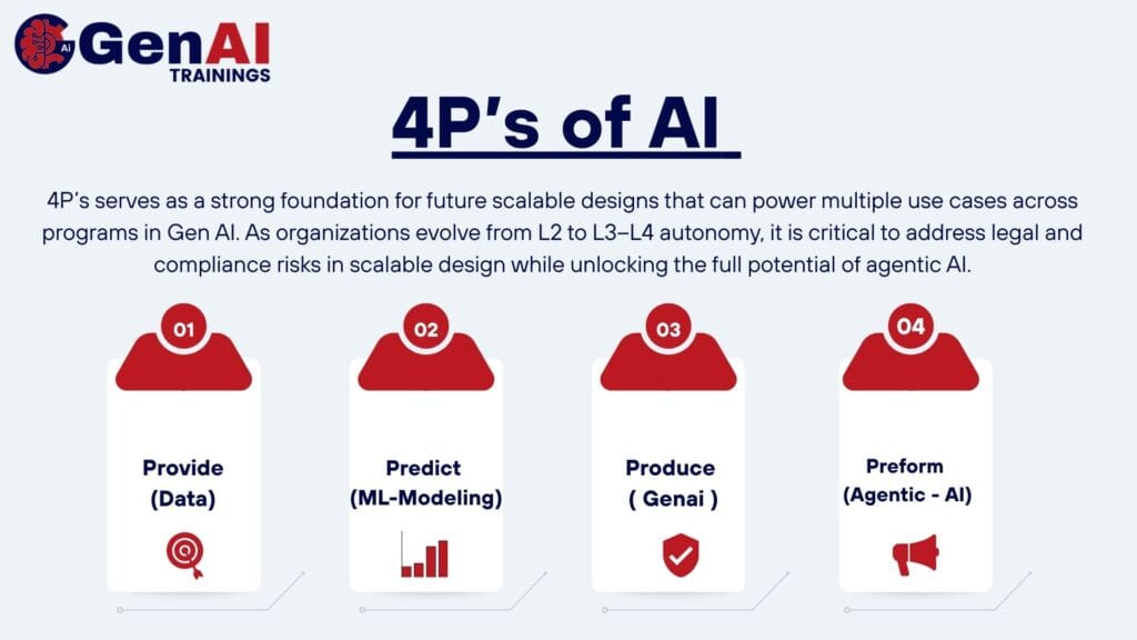 Genai Trainings The 4P’s of AI framework Provide, Predict, Produce, and Perform is a strategic maturity model designed to help organizations systematically unlock enterprise value from artificial intelligence. Provide focuses on delivering trusted, AI-ready data and contextual intelligence to empower informed decision-making. Predict leverages advanced analytics and machine learning to anticipate trends, risks, and opportunities with precision. Produce enables the creation of new content, code, designs, and solutions through Generative and Agentic AI systems, accelerating innovation and operational efficiency.